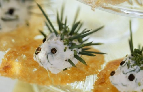 - Für die Igel die Frühlingszwiebeln waschen, putzen und fein hacken. den Frischkäse mit der Sahne und Zitronensaft verrühren und mit Salz und Pfeffer abschmecken. Mit zwei Teelöffeln (zwischendurch in Wasser eintauchen) 16 kleine Igel formen. Den Schnittlauch waschen, trocken schütteln und schräg in 4 - 5 cm lange Streifen schneiden. Die Schnittlauchstreifen als Stachel in die Igel einstecken und mit den Pfefferkörnern Augen und Schnauze andrücken. Zum Servieren auf die Käsewaffeln setzen.